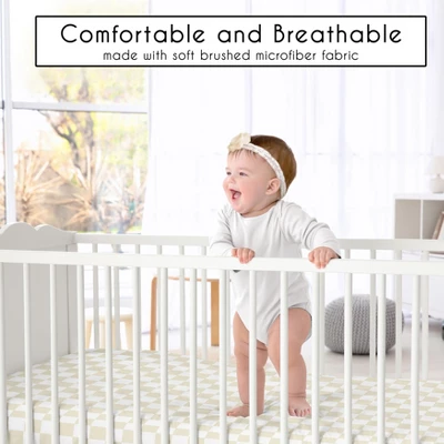 Gingham Checkered Plaid Collection Sweet Jojo Designs crib sheets are the ideal combination of unique designs, exclusive patterns, and classic colors to bring a stylish upgrade to your baby nursery or toddler bedroom and are sure to be your favorite newborn essential. This crib mattress sheet is designer curated and made with soft fabrics to complete your dream infant nursery. Our cribsheets feature a fully elastic bottom for a secure fit on most standard crib size and toddler beds. Our infant and toddler fitted crib sheets are lightweight and durable making the perfect sleeping environment for your bundle of joy. Don’t forget to purchase extras! It’s always good to have multiple baby bedding sheets to use in between laundry wash days and easily change in case of unexpected, late night messes. Or bring extra sheets from home when on vacation or traveling to grandparents house to give your tot a familiar place to rest their head no matter where you are. Pair your crib baby sheet with your favorite Sweet Jojo Designs collections and coordinate with our crib bedding sets, swaddle blankets, playmats and baby room decor accessories. A crib mattress sheet is essential for your baby’s comfort and ensuring a soft, breathable surface for restful sleep.This newborn crib sheet fits snugly over the mattress, providing a secure and smooth fit that reduces shifting and bunching. Adding a crib mattress sheet to your gift registry is a thoughtful way to prepare for your baby’s arrival, as it’s a practical and useful item every parent will need. And remember, you can never have too many baby sheets! Add a baby cribsheet to your list of must haves for your little one! This soft crib sheet is stretchy and comfortable to give your infant or toddler the perfect setting for a good night’s rest. It’s thoughtfully designed with elastic sewn around the entire bottom edge of the sheet for a secure fit on most standard sized cribs and toddler beds. Use one crib sheet in your newborns bed and have spares nearby to swap in between washes and to be prepared if an accident happens in the crib. The interior design of a nursery can be planned entirely around a single focal point like the crib sheet. It makes the perfect gift with one of Sweet Jojo Designs coordinating crib bed sets, changing pad covers, nursing pillow covers, nursery room decoration accessories and window treatments. Include one in your baby shower gift basket, gender reveal presents or add to your baby gift registry to ensure you have all you need to complete your Sweet Jojo Designs baby bed room look. SNUG FIT: Includes (1) Fitted Crib Sheet 52in. x 28in. x 8in. Our newborn standard crib sheets fit snugly, with premium elastic sewn around the entire bottom edge for a secure fit on most standard sized cribs and toddler beds, to reduce shifting and bunching. This brushed microfiber crib sheet features an exclusive trendy design of a bold and timeless classic retro style geometric checkerboard minimalist taupe check print and is gentle on delicate skin to foster a soothing sleep environment.