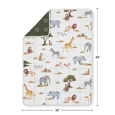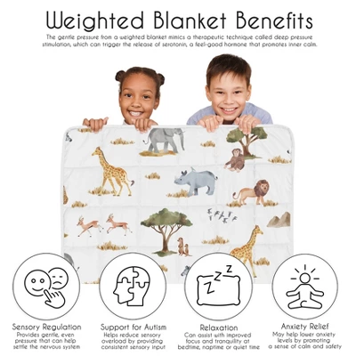 Jungle Collection Sweet Jojo Designs helps improve and foster a comforting and safe sleep environment for your little one with our weighted blankets for kids. This weighted blanket cover was created to become your next bed time essential. Made with a brushed microfiber fabric and non-toxic glass beads, this kids weighted blanket 5 pounds has quilted grid squares to ensure an even distribution of weight across the body to reduce tossing and turning during the night and feel like a cozy hug! Lay the toddler weighted blanket to help induce a deep and restful slumber by stimulating important pressure points and relaxing the body to improve the physical development and mental development and concentration in the daily life of your growing child.  Use this as a sensory weighted blanket for kids who live with anxiety and/or Autism to provide a sense of security while lowering anxiety levels, reducing sensory overloads and promoting a sense of peace and safety. This portable, small  weighted blanket can be used all around the house or bring with you on-the-go.  Being smaller than an ordinary blanket, this doubles as a weighted blanket for adults! Concentrate the weight on your body with a weighted lap blanket while you read, meditate, watch television, lay on the couch, or mindlessly scrolling on your phone. Stains and spills are apparent in everyday life when children are involved, so having a machine washable weighted blanket is important. Durability and quality allows you to throw this sensory blanket into the wash and tumble dry low for repeat use. Choose the perfect weighted blanket for your child and watch them drift off into sweet, peaceful dreams! Featuring a layered design of light fill and evenly distributed non-toxic glass beads and an outer layer of exclusively designed brushed microfiber fabric of a dark hunter green, gray, yellow, grey, rust orange, black and white boho wildlife safari animal elephant giraffe lion monkey leopard cheetah zebra bird jungle animals print and reverses to a dark green mudcloth print and finished with solid white trim.