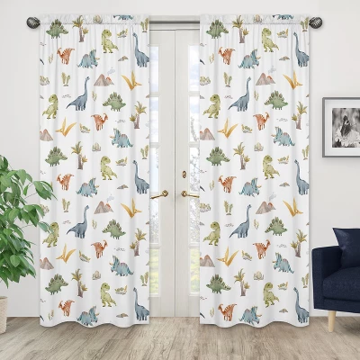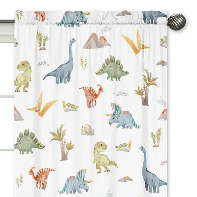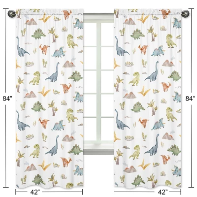 Watercolor Dinosaur Dino Collection Sweet Jojo Designs elevates any room with a pair of lightweight window curtain panels. Use these window treatment coverings for the perfect room decor to add a stylish upgrade to your baby nursery, family room, foyer, gaming room, guest room, home gym, home office, kitchen, livingroom, apartment, children bed room, classroom, teen college dorm, den, home theater, kids bed room, mud room, or play room. Made to fit standard rods up to 0.75 inches in diameter, Sweet Jojo Designs panels create a unique decorative frame on the sides of your windows when not closed to filter light into the room. These designer window coverings can be used as kitchen draperies, living room curtains, bedroom sheers, or office curtains to provide a soft and relaxing ambiance in any space as they diffuse natural light. Use with a multi-tiered rod can allow you to layer a valance on top of a curtain for a cascading or flowing effect for a unique interior design upgrade. Single layer rod pocket curtains are a great decorative addition to any room. These semi-opaque curtains feature exclusive patterns, prints and colors to match your favorite Sweet Jojo Designs collections and coordinate with your crib bedding sets, twin or queen bed sets, window valances, and room decor accessories to give you a complete look for any room you are wishing to transform! These brushed microfiber light filtering curtains are made of a single layer of fabric and feature an exclusive design of slate blue, turquoise, sage green, hunter green, orange and yellow watercolor dinosaurs, prehistoric plants, trees and volcanoes, dinosaur eggs, and a dino animal track footprint and are made to match the Watercolor Dinosaur Dino Collection.