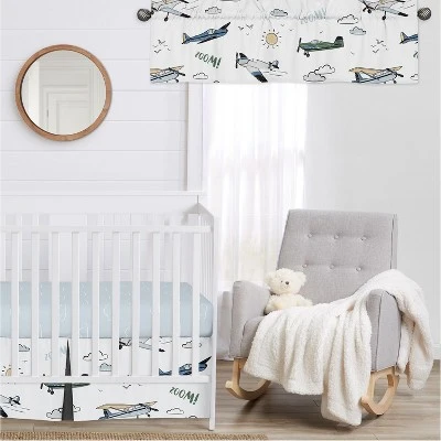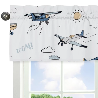 Airplane Green and Blue Collection Sweet Jojo Designs elevates any room with a window valance. A fabric window valance is a simple yet stylish way to add a finishing touch to your home decor. This sheer valance can add a pop of color or texture with exclusive patterns and prints and fit standard windows and window rods up to 0.75 inches in diameter to create a unique look and effortlessly conceal rods or hardware for a cleaner and more streamlined look. Use a stylish curtain valance to provide a decorative flair to your room decor and add a designer update to your children bed room, classroom, livingroom, mud room, foyer, gaming room, guest room, baby nursery, apartment, home gym, home office, home theater, teen college dorm, den, family room, kids bed room, kitchen, entryways, hallways or play room. Versatile window curtain valances can be used as a bathroom window valance, kitchen valance, kids room valance, or even as a playroom valance to provide a soft and relaxing ambiance to any room with bare windows. Pair your elegant window valance with your favorite Sweet Jojo Designs collections and coordinate with your crib bedding sets, twin or queen bed sets, wall decor, window curtains, and room decor accessories to give you a complete look for any room you are wishing to transform! Window curtain valances are the perfect finishing touch to any nursery, apartment, childs bedroom, classroom, teenagers’ college dorm, gaming room, guest room, home gym, den, family room, foyer, toddlers bed room, kitchen, home office, home theater, living room, mud room or play room, making this your new must have household decor essential! Purchase as many as you need to cover all the windows in a room or put more than one on each window to achieve an extra ruffly and textured effect. Add a kitchen valance, bathroom window valance or kids room valance to your home decor to ensure a complete look. This single lined rod pocket valance is versatile enough to fit nearly anywhere, making it a small detail that can serve as a focal point with big impact. Swag valances provide warmth and dimension to even the most industrial windows or their coverings. A multi-tiered rod can allow you to layer multiple valances for a cascading or flowing effect for a unique interior design upgrade. This brushed microfiber light filtering window valance features an exclusive design of a grey, yellow, green, gray, white and blue vintage airplanes, transportation, air plane, clouds, sun, sky, aviator, aviation, airplane print made to coordinate with the Vintage Airplane Collection.