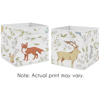 Woodland Toile Collection fabric storage bins by Sweet Jojo Designs offer a stylish yet functional storage solution. What a perfect way to transform your organizational system in any room. This set of two foldable storage cubes can be used in most standard cubby-hole shelving furniture in a classroom, as stand-alone bins in a playroom, or collapsed to save space when not in use in your little one’s bedroom. Please note: actual print may vary on bins featuring printed fabric. Sweet Jojo Designs creates various coordinating room accessories and decor for all of their children’s bedding and nursery bedding set collections (These items not included). Features a grey, blue, green and earth toned woodland animal toile print