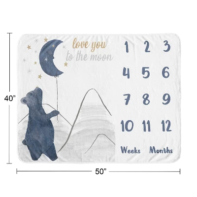 Moon Bear Collection Sweet Jojo Designs 3 Piece Milestone Baby Blankets offer the perfect prop to help you capture monthly growth achievements. Each blanket features the numbers 1-12 and two soft frames that you can easily place over the numbers to correspond with your little one’s age in months and weeks. They make an adorable backdrop for all your baby’s photos as you celebrate each month of their first year or use as a security blanket, nursery receiving swaddle, tummy time floor playmat, or even a stroller or car seat cover. Add these lightweight blankets to any new parent list or give as the best keepsake baby shower gift. Snapshots taken with this soft infancy chart tracker will help you make the most precious social media posts to share on your wall or feed for friends, family, and followers to enjoy. No filter needed! Pair your blanket with your favorite Sweet Jojo Designs crib bedding sets, receiving security blankets, changing pad covers, crib sheets and other baby room decor accessories (These items not included). 100% plush minky fleece featuring a navy blue, grey, and gold woodland bear, moon and mountains with an inspirational “Love You To The Moon” quote.
