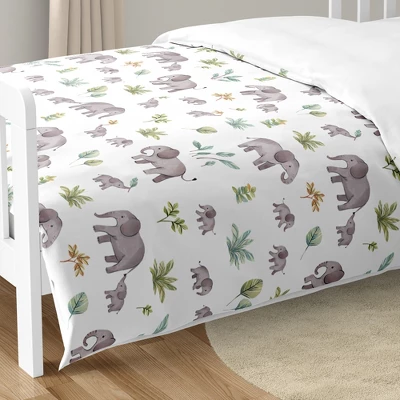 Watercolor Elephants Collection Sweet Jojo Designs creates various coordinating room accessories for all of their children’s bedding sets including wall decor, hampers, lampshades and window treatments. Toddler set includes: Toddler Comforter, Fitted Sheet, Flat Sheet, Sham, and Pillow Case. Sweet Jojo Designs creates various coordinating room accessories and decor for all of their children’s bedding and nursery bedding set collections (These items not included). This set boasts a hand painted watercolor print complete with mother and baby elephants, palm trees and tropical plants and solid grey and white fabrics.