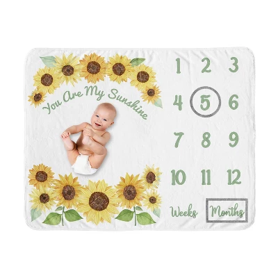 Sunflower Collection Sweet Jojo Designs 3 Piece Milestone Baby Blankets offer the perfect prop to help you capture monthly growth achievements. Each blanket features the numbers 1-12 and two soft frames that you can easily place over the numbers to correspond with your little one’s age in months and weeks. They make an adorable backdrop for all your baby’s photos as you celebrate each month of their first year or use as a security blanket, nursery receiving swaddle, tummy time floor playmat, or even a stroller or car seat cover. Add these lightweight blankets to any new parent list or give as the best keepsake baby shower gift. Snapshots taken with this soft infancy chart tracker will help you make the most precious social media posts to share on your wall or feed for friends, family, and followers to enjoy. No filter needed! Pair your blanket with your favorite Sweet Jojo Designs crib bedding sets, receiving security blankets, changing pad covers, crib sheets and other baby room decor accessories (These items not included). 100% plush minky fleece featuring a yellow and green sunflower floral with an inspirational “You Are My Sunshine” quote.