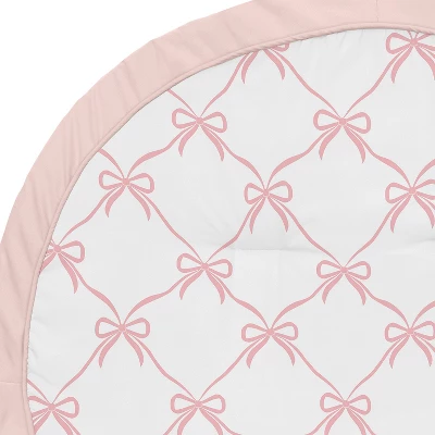 Ballerina and Ballet Bows Collection Sweet Jojo Designs baby play mat makes tummy time and child development stylish and fun. These adorable baby tummy time activity mats will transform any room into the perfect play space while keeping your little one on a soft surface while learning to crawl and stand. Using a tummy time mat gives your bundle of joy the ability to have a safe and comfortable area to play and crawl on the floor while also developing the necessary skills to be able to eventually stand and walk! Use an infant playmat in your nursery, baby room, playroom, bedroom, playpen, apartment, kids play house, living room, play yard, or even home office. Made with soft fabrics and a lofty fill for your baby’s comfort, this multi-functional floor mat comes in a variety of prints and patterns to upgrade any rooms’ decor. This foldable play mat is small enough to roll up and take on the go! Great for vacations, playdates, beach outings, holidays, birthdays, baby shower gifts, baby registry gifts and everyday use. Pair your infant play mat with your favorite Sweet Jojo Designs collections and coordinate with our crib bedding sets, crib sheets, swaddles, milestone blankets and baby room decor accessories. This lightly padded floor mat is the perfect addition to any nursery or baby room to help the development of crawling and standing for your little one! A round infant floor mat can be used in baby nurseries, play rooms, play pens, playhouse, livingroom, bed room, apartment, play yard, or home office during tummy time to get your new addition comfortable with crawling and getting practice in standing and eventually walking. Enrich your childs development with a portable play mat and make time for crucial prone position practice possible anywhere you might go. Makes the perfect gift to coordinate with Sweet Jojo Designs nursery bedding, storage solutions, window treatments, nursing pillow covers, wall decor, nursery room decoration accessories and layette sets. Include it in your baby shower gift basket or gender reveal presents or add to your baby gift registry to ensure you have all you need to complete your Sweet Jojo Designs baby bed room look. This brushed microfiber newborn play mat is designed using a blush and white shabby chic dancer princess bows print and finished with pink piping and border.