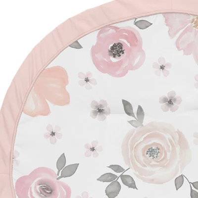 Watercolor Floral Pink and Grey Collection Play Mats by Sweet Jojo Designs make tummy time and child development stylish and fun. Made with soft fabrics and fluffy fill, this multi-functional mat is small enough to take on the go. These adorable playmats will transform any room into the perfect play space. Great for vacations, playdates, beach outings, and everyday use at home. Always be aware of baby’s surroundings and keep an eye on baby while in use. Not intended for sleep. Sweet Jojo Designs creates various coordinating room accessories and decor for all of their children’s bedding and nursery bedding set collections (These items not included). Playmat is designed using a blush pink, grey, and white watercolor floral print and finished with blush pink piping and border – Brushed Microfiber