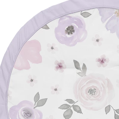 Watercolor Floral Lavender and Grey Collection Play Mats by Sweet Jojo Designs make tummy time and child development stylish and fun. Made with soft fabrics and fluffy fill, this multi-functional mat is small enough to take on the go. These adorable playmats will transform any room into the perfect play space. Great for vacations, playdates, beach outings, and everyday use at home. Always be aware of baby’s surroundings and keep an eye on baby while in use. Not intended for sleep. Sweet Jojo Designs creates various coordinating room accessories and decor for all of their children’s bedding and nursery bedding set collections (These items not included). Playmat is designed using a lavender purple, pink and grey watercolor floral print and finished with lavender purple piping and border – Brushed Microfiber