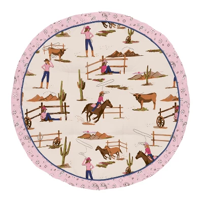 Western Cowgirl Collection Play Mats by Sweet Jojo Designs make tummy time and child development stylish and fun. Made with soft fabrics and fluffy fill, this multi-functional mat is small enough to take on the go. These adorable playmats will transform any room into the perfect play space. Great for vacations, playdates, beach outings, and everyday use at home. Always be aware of baby’s surroundings and keep an eye on baby while in use. Not intended for sleep. Sweet Jojo Designs creates various coordinating room accessories and decor for all of their children’s bedding and nursery bedding set collections (These items not included). Playmat is designed using a light pink, brown, beige, blue, cream, taupe, tan and off white wild west vintage country retro animal horse southwest western cowgirl print and finished with blush pink bandana print piping and border – Brushed Microfiber