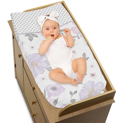 Watercolor Floral Lavender and Grey Collection Sweet Jojo Designs baby changing pad covers is the perfect nursery essential – it is created with soft fabrics in exclusive patterns and colors and finished with an embellished plush quilted diamond design to hold lining in place. Use a changing mat cover for extra protection and comfort for newborns and toddlers during outfit changes or changing diapers. And it’s always a good idea to buy extras so you can easily change it out when it’s time to wash. Sweet Jojo Designs offers coordinating crib bedding sets, receiving security blankets, nursing pillow covers and other baby room decor accessories (These items not included). This changing pad features lavender purple and grey watercolor floral print.