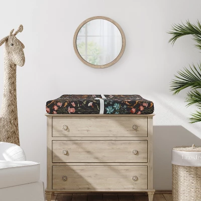 Boho Floral Wildflower Black and Orange Collection Sweet Jojo Designs baby changing pad sheet covers is the perfect nursery essential. Use a changing mat cover sheet for extra protection and comfort for newborns and toddlers during outfit changes or changing diapers. And it’s always a good idea to buy extras so you can easily change it out when it’s time to wash. Sweet Jojo Designs offers coordinating crib bedding sets, receiving security blankets, nursing pillow covers and other baby room decor accessories (These items not included). This brushed microfiber diaper pad cover sheet features an exclusive design of a black, rust orange, teal turquoise blue, green, pink and yellow boho wildflower vintage floral bohemian farmhouse daisy leaves botanical paisley leaf flower garden indie rustic cottagecore print.