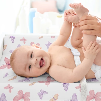 Butterfly Blush Pink and Purple Collection Sweet Jojo Designs baby changing pad sheet covers is the perfect nursery essential. Use a changing mat cover sheet for extra protection and comfort for newborns and toddlers during outfit changes or changing diapers. And it’s always a good idea to buy extras so you can easily change it out when it’s time to wash. Sweet Jojo Designs offers coordinating crib bedding sets, receiving security blankets, nursing pillow covers and other baby room decor accessories (These items not included). This brushed microfiber diaper pad cover sheet features an exclusive design of a blush pink, purple lavender and yellow shabby chic colorful pastel lilac watercolor butterfly pattern.