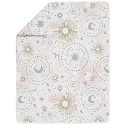 Celestial Pink and Gold Collection Sweet Jojo Designs creates various coordinating room accessories for all of their children’s bedding sets including wall decor, hampers, lampshades and window treatments. Toddler set includes: Toddler Comforter, Fitted Sheet, Flat Sheet, Sham, and Pillow Case. Sweet Jojo Designs creates various coordinating room accessories and decor for all of their children’s bedding and nursery bedding set collections (These items not included). Featuring exclusive fabric of blush pink and gold celestial sky moon and stars.