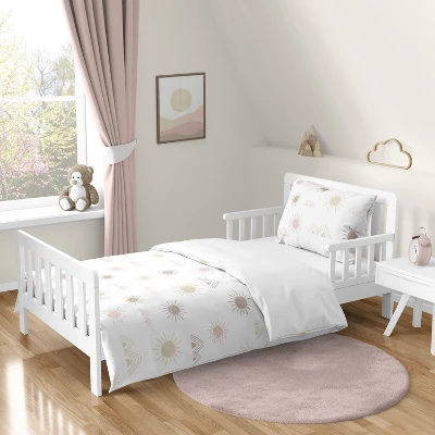 - Toddler comforter, standard sham, standard pillowcase, fitted sheet and flat sheet