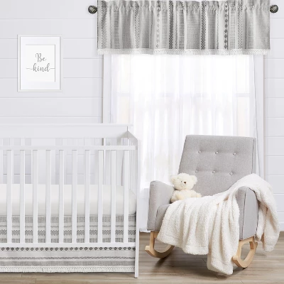Grey Boho Jacquard Collection Sweet Jojo Designs window valance will help decorate and upgrade any room in your home. This beautiful window valance is designed to fit most standard windows. This valance softens the look of the window and obscures pulled up blinds. Sweet Jojo Designs creates various coordinating room accessories and decor for all of their children’s bedding and nursery bedding set collections or can be used as an accent with your own room design (These items not included). Features a grey, off white and ivory boho bohemian modern geometric jacquard print